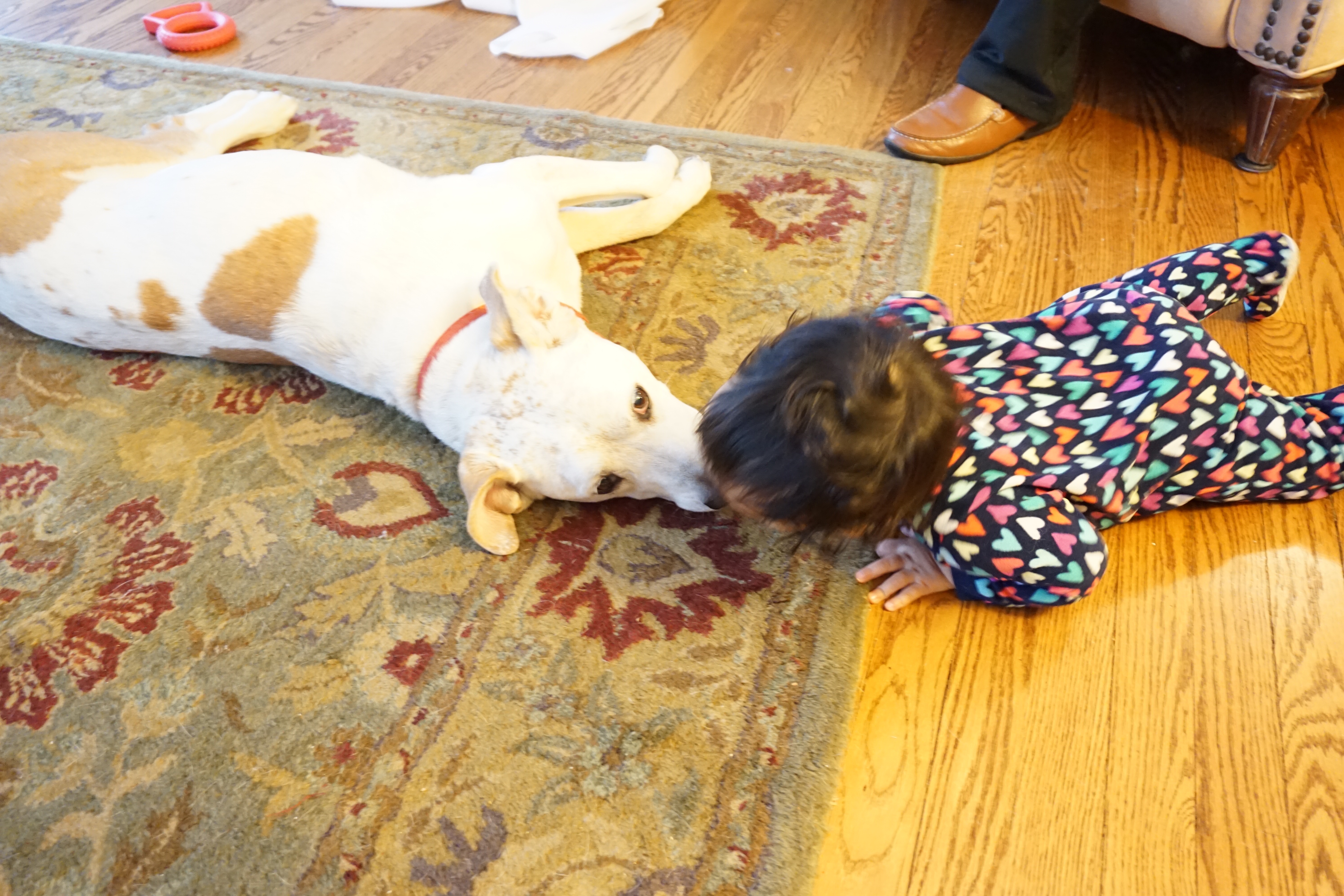 This stubborn, sweet, active dog has a personality that made all of us connect with her – she demands attention and our food, greets us with full body wags, and constantly challenges authority. This tough mutt can be gentle, too, and lets us hold her when we are upset or curls up in that perfect space between the couch and one of our bodies, often my mom, in order to connect and get in some good petting after a long day.
